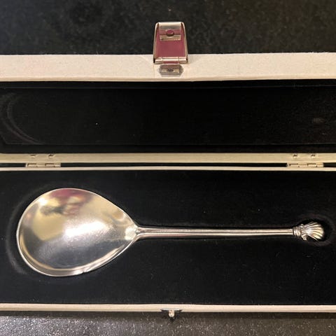 Bestikksett. Inkluderer flere skjeer med dekorative håndtak, levert i sort oppbevaringsetui. Materiale i støpt tinn.