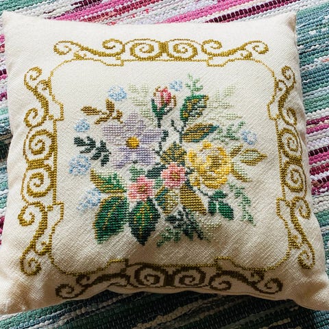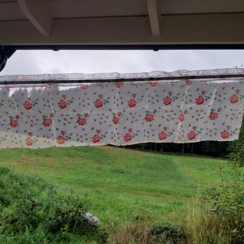 Flott vintage hjemmesydd gardinkappe i nydelige farger, og med blondekant.