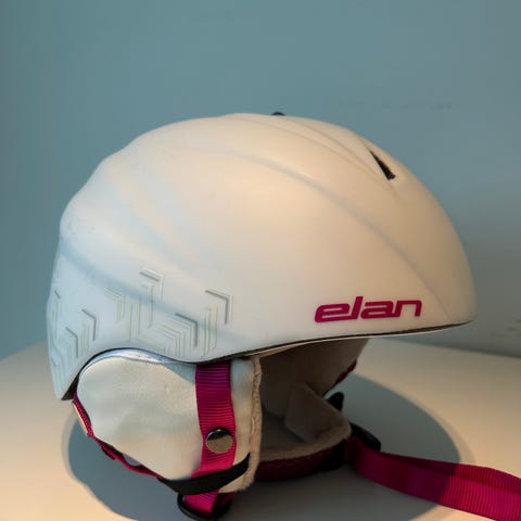 Hjelmen er hvit med innvendig polstring i mørk blå farge, og har justerbar stropp under haken.