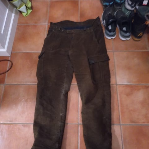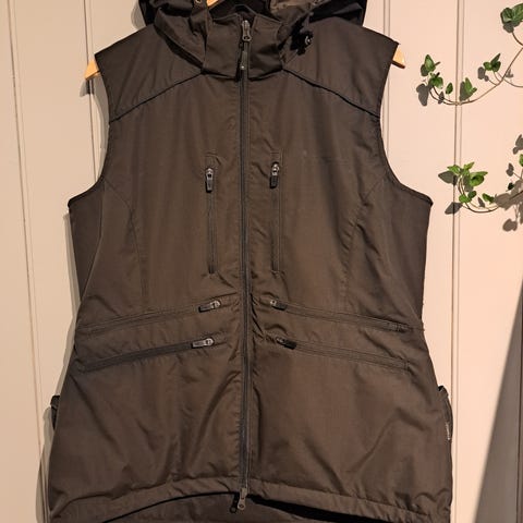 Avtagbar hette. Stor lomme bak, mange små lommer foran.