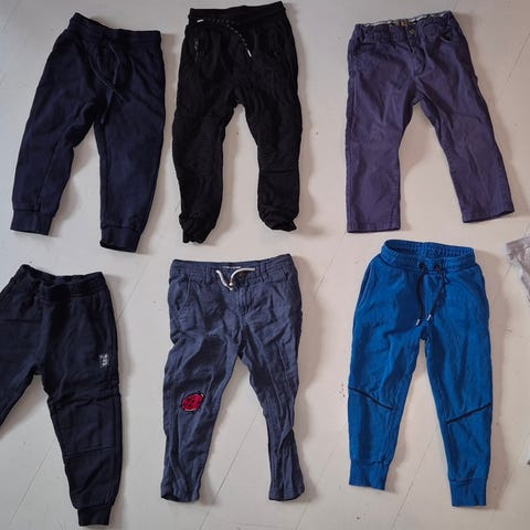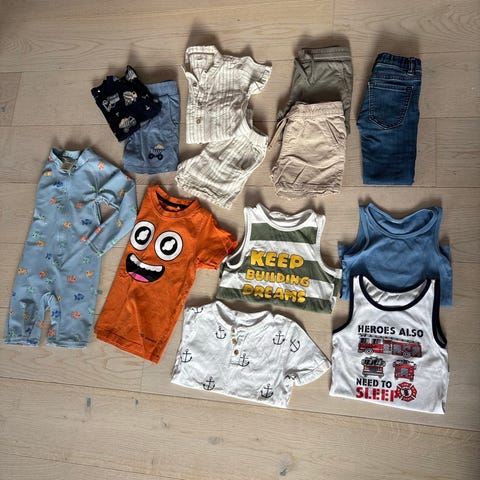 En gråtass ullgenser, en regnbukse, 2 Uv skjorter (en kort og en langermet), 2 shorts, 6 t-skjorter, 5 kjøpbukser, 3 hjemmelagde bukser, 3 hjemmelagde gensere og 2 gensere med glidelås