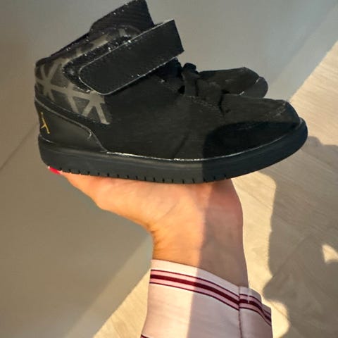 Air Jordan Nike barn sko i størrelse 28, designet for gutter. Skoene har en kombinasjon av svart og rød farge, og er laget i materialer som gir støtte og komfort for barnets føtter.