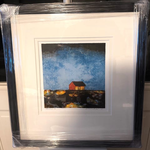 Maleri som viser et hus ved vannet med mørk blå himmel og oransje lys på huset og landskapet. Bildet er innrammet i en hvit ramme.nyfelig innramming i Art glass , sterkte bilder av Per Sødal Hus I. Hele serien er nydelige bilder☺️