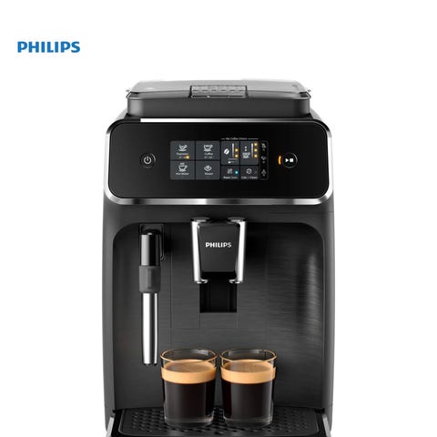 Philips LatteGo . Maskinen har integrert melkeskummer med LatteGo-system, berøringspanel med flere valg for kaffetyper, og kompakt design. Egnet for hjemmebruk og tilberedning av ulike kaffedrikker som espresso og cappuccino.