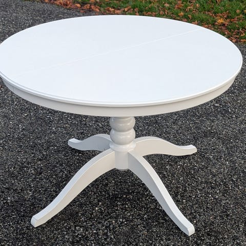 Brukt eldre spisebord m / en klaff selges. Rundt dm 118 cm. Inklusiv en klaff 158 cm.