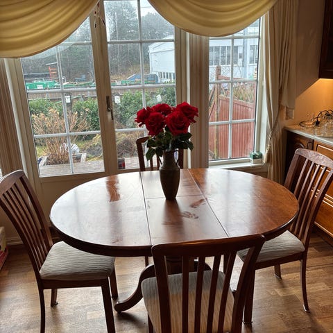Det er en del flekker på stolene, som sikkert kan vaskes bort. Bare foten til dette bordet er verdt mye mer enn tusenlappen.