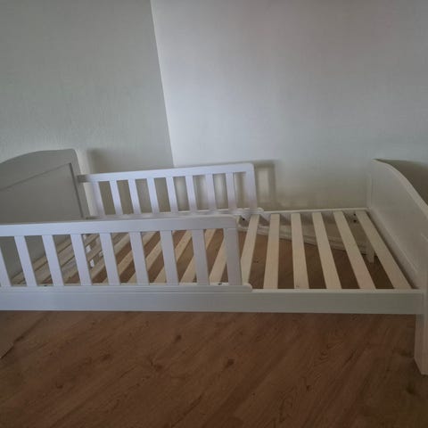 Sengen har en praktisk oppbevaringsskuff under, perfekt til sengetøy, leker eller klær. Stabil og solid konstruksjon, og passer godt som overgang fra sprinkelseng.