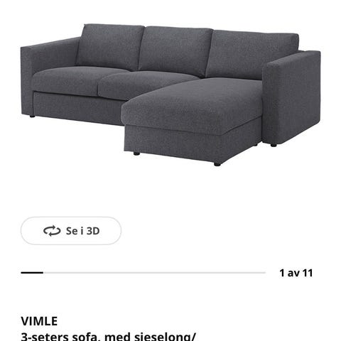 Selger en stilren og komfortabel IKEA Vimle sofa med sjeselong og praktisk oppbevaringsplass. Sofaen er romslig, solid og svært behagelig å sitte i.