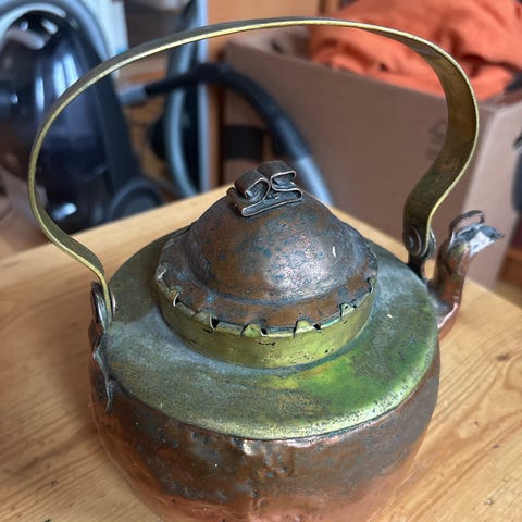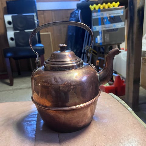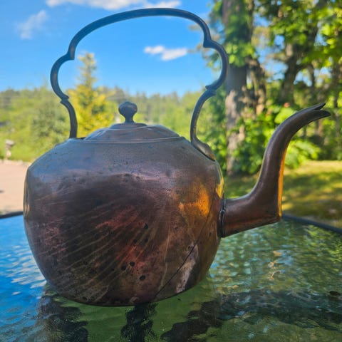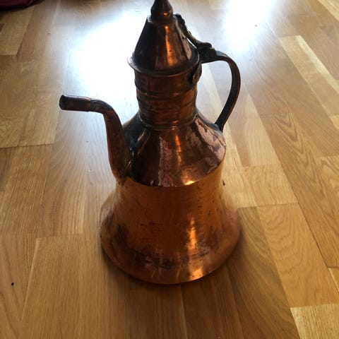 Kobber tekanne med lokk og buet håndtak. Tekannen har en rund form og er laget av kobbermateriale.
