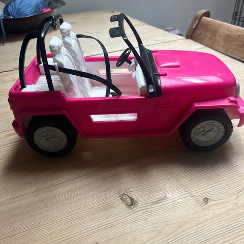 Barbie lekebil utformet som en rosa buss. Laget i plastmateriale, egnet for barn. Inkluderer detaljer som vinduer og dører som kan åpnes. Passer til rollelek og samlekjøring.