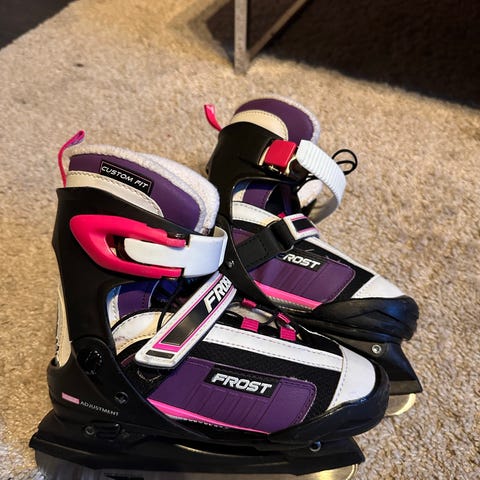 Skøytene har svart, blå og oransje fargekombinasjon med justerbar lukking..