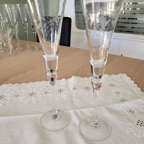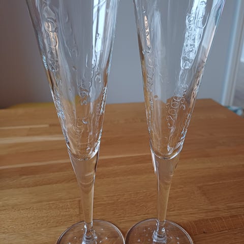 Selges samlet. 6 flute glass fra le Gioie, laget i Italia. Flotte detaljer med gullbord og tvinnet stett, spesielt fine til selskap og servering. Kan brukes til champagne eller hvitvin.