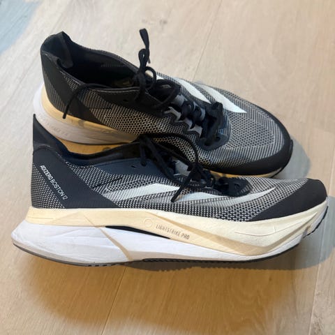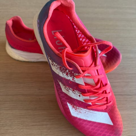 Adidas Adizero løpesko i størrelse 43. Skoene er hvite med svarte detaljer og laget for løping. Brukt 1 gang.