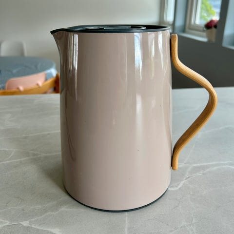 Stelton Emna kanne i grå farge med håndtak av tre. Den eg 24 cm høy.