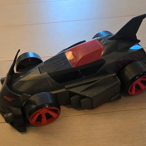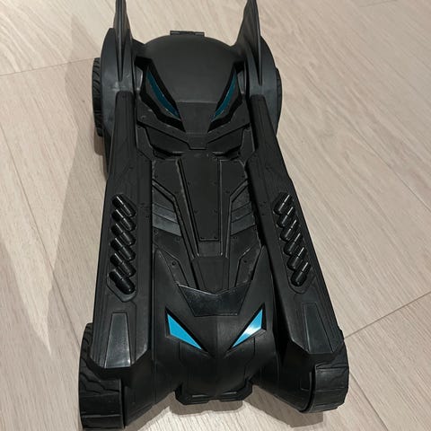 Batman Batmobile lekebil i blå farge med tilhørende Batman-figur. Lekebilen har en åpning på toppen hvor figuren kan plasseres. Passer som leketøy for barn.