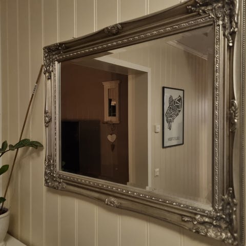 Str er 85 cm i bredde og høyde/ speilet i midten er 14 cm.
