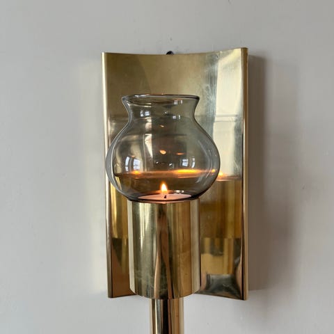Vintage Odel messing lysestake med 3 glasskupler. En del patina, bruksmerker og synlige tegn etter bruk. Foten har en liten ujevnhet. En unik og sjelden lysestake.