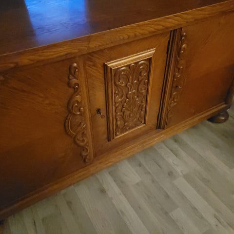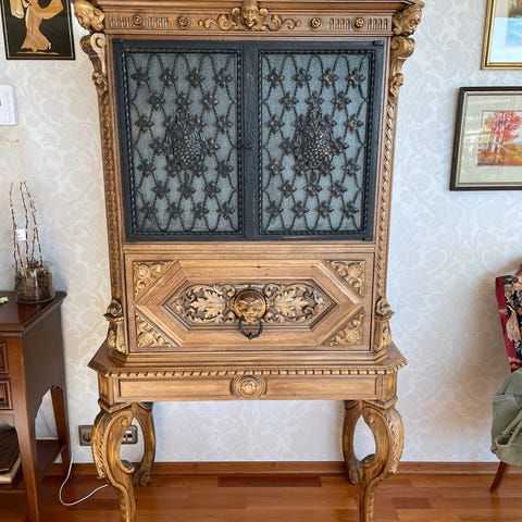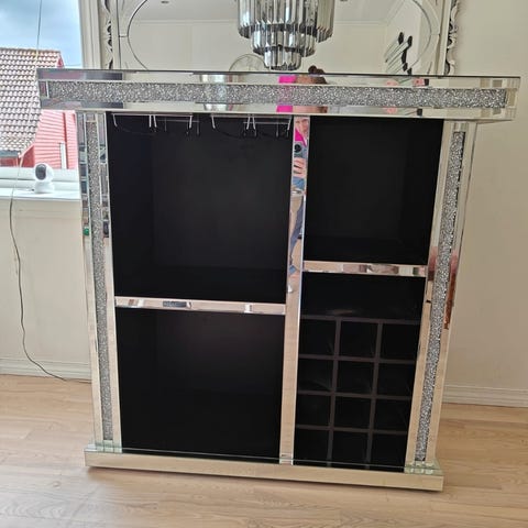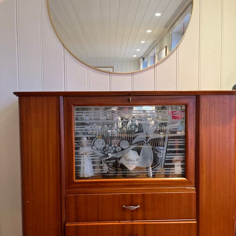 Ovalt barskap i tre og glass m/ dør på bak- og fremside.