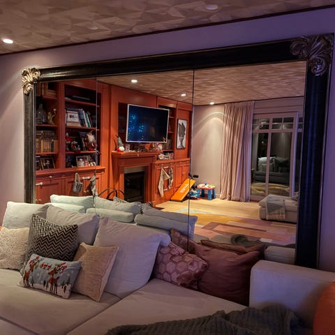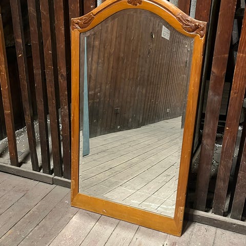 Tøft, stort speil innrammet i «jernrør». 91x51cm.