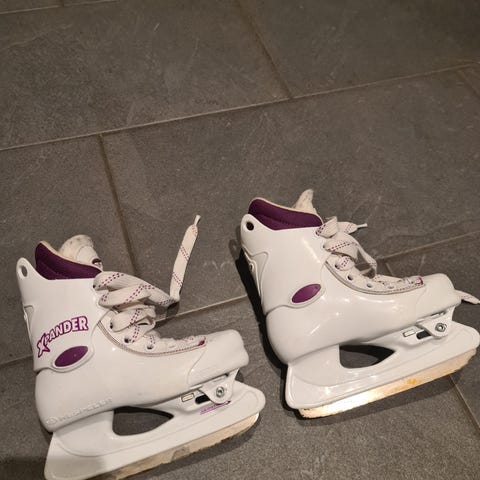 Hvite skøyter for barn i størrelse 29, egnet for ulike skøyteaktiviteter. Skøytene har snøring og metallblad, designet for å gi støtte og stabilitet under bruk.