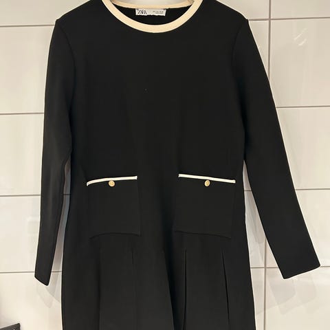Zara hverdagskjole i størrelse L, laget av polyester. Kjolen er svart og har et leopardmønstret belte. Lommer på hver side.