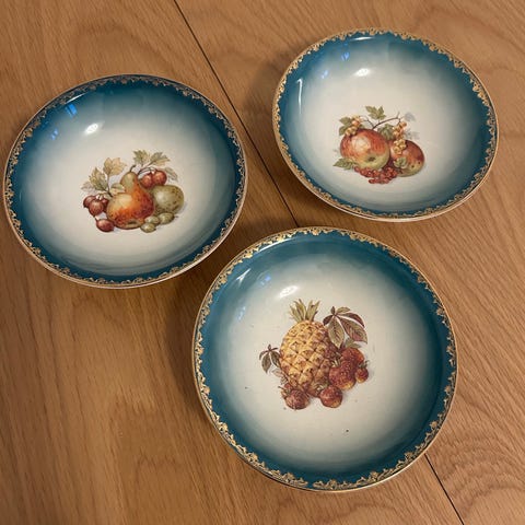Skålen har forskjellig fruktmotiv og pyntet kant i gull. Selges samlet, kan sendes.