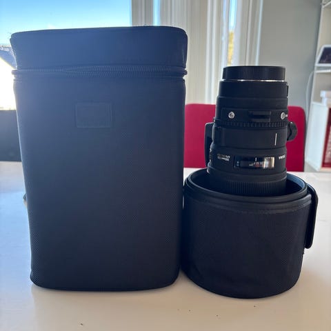 Linsa fungerer, ingen store skrammer eller merker, følger med en lærpose som henger over den