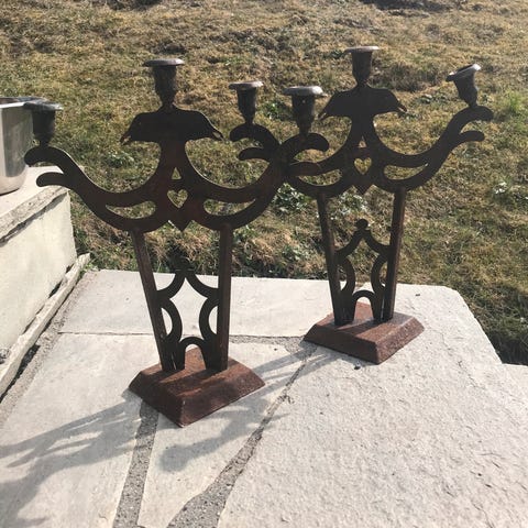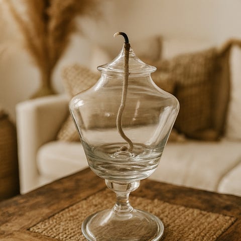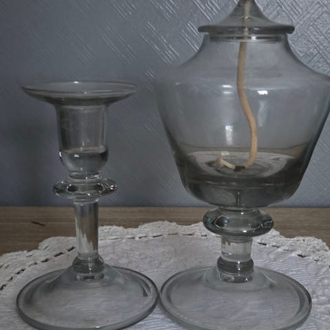 Olje lampe som mangler toppen. Den er fra serie Tangen, grå (sotet glass), Hadeland Glassverk.