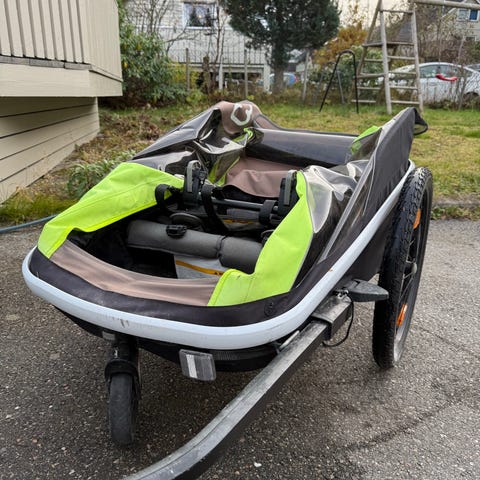 Sykkelvogna er godt brukt, men også bra kvalitet. Dette er toppmodellen til Burley og det er veldig dyre sykkelvogner ny (Canadisk merke).