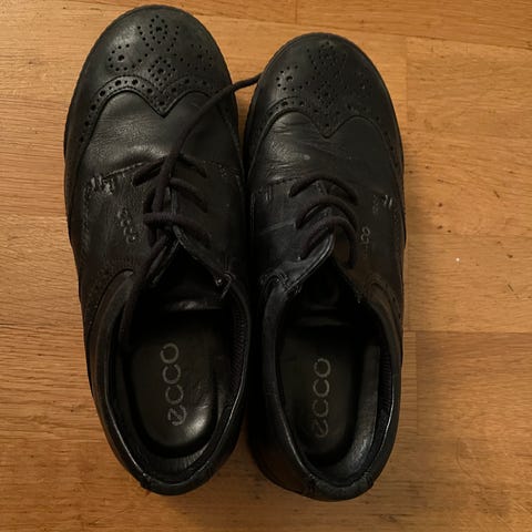 ECCO barnesko for gutt i størrelse 39. Skoene er laget av svart skinn og har snøring for justerbar passform. Egnet til hverdagsbruk og formelle anledninger.