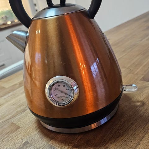 Princess vannkoker i rustfritt stål med sort lokk og håndtak. Den har en kapasitet på opptil 1,2 liter og avtakbar base med ledning. Egnet for oppvarming av vann til ulike formål.