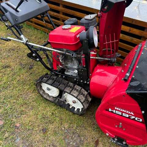 Honda HS970 snøfreser med beltedrift. Maskinen har en kraftig motor og er designet for effektiv snørydding. Utstyrt med robuste belter for bedre fremkommelighet på snødekte underlag.
