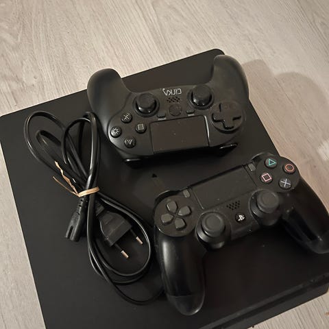 PlayStation 4 spillkonsoll med to trådløse kontroller. Kontrollene er godt brukt.