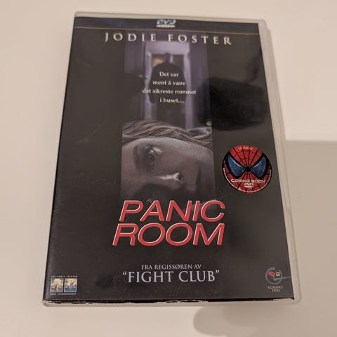 Panic Room DVD med originalt filmcover og baksideinformasjon. Filmen er en thriller som handler om en kvinne og hennes datter som søker tilflukt i et sikkert rom i huset sitt under et innbrudd.