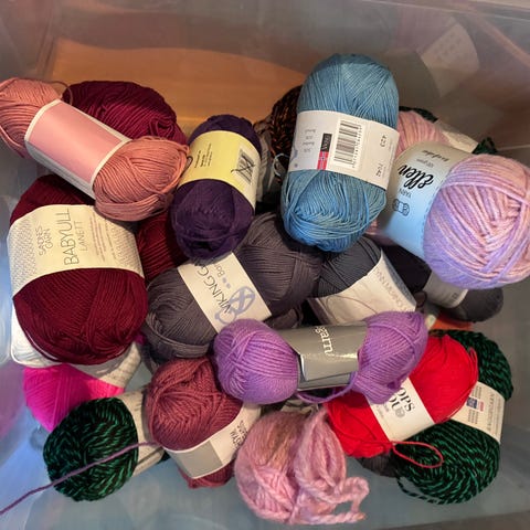 Blandet garn i ulike farger og materialer. Egnet for ulike strikke- og hekleprosjekter. Garnet består av flere nøster i farger som rød, hvit, lilla, blå, grønn og gul.