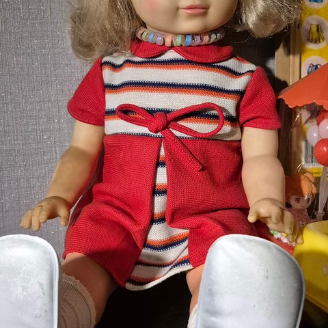 Søt dukke med sjel. Fine armer med søte fingre. Myk kropp. Fin til dekorasjon, men kan lekes med. Har øyevipper. Kan hentes eller sendes. Frakt 140,- norgespakke med sporing.