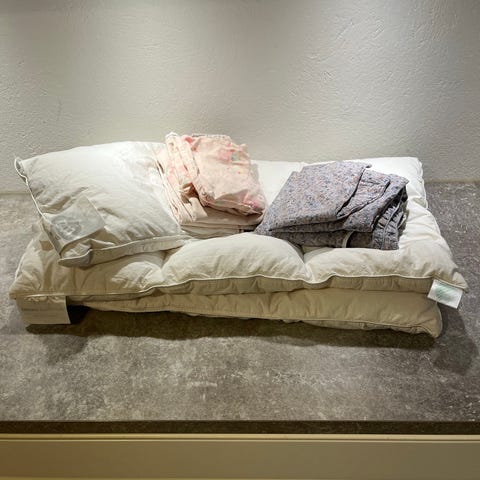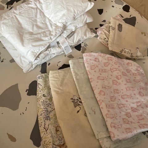 Pent brukt dundyne, to sett dyne og putetrekk i størrelse 65 X 80 cm og et helseteppe i bomull til salgs.