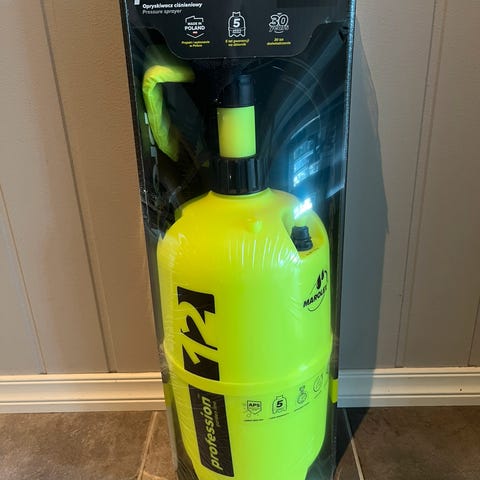 Marolex lavrykksprøyte med kapasitet på 12 liter. Laget i gul plast med svart håndtak og skulderrem. Utstyrt med pumpehåndtak, slange og sprøytemunnstykke med justerbar spredning. Egnet for bruk i hagearbeid og andre sprøyteoppgaver.