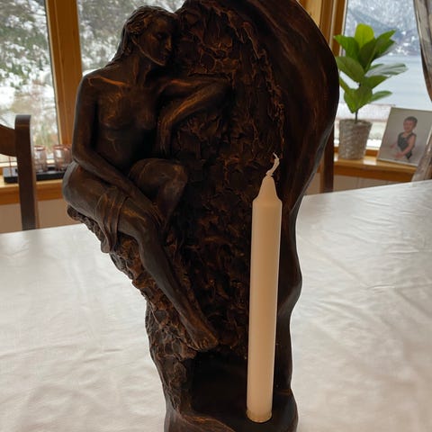 Sett med dekorative figurer og lysestake i bronse. Inkluderer to par figurer, to som sitter sammen og to enkle, et "fat"og en lysestake med plass til vanlig stearinlys . Passer som dekorative elementer i hjemmet. Selges helst samlet.