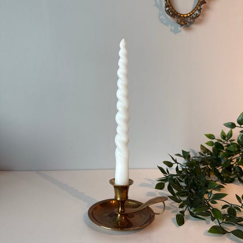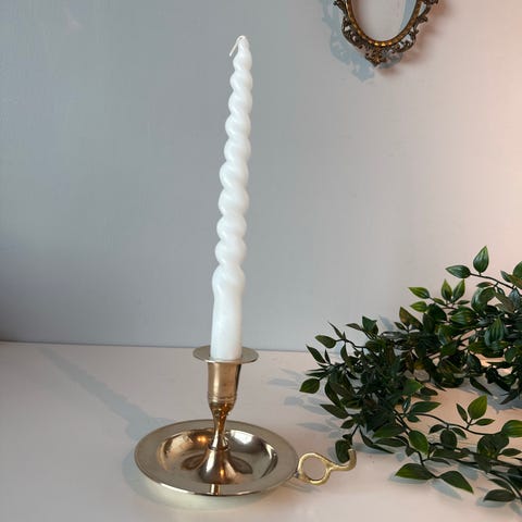 Vintage lysestake i messing med rund skål for å samle opp voks . Passer til dekorasjon og belysning i hjemmet. H: 9,5 cm. Søkeord: vintage, retro, interiør,stue,dekor,dekorasjon,design,stilrent,elegant, julepynt