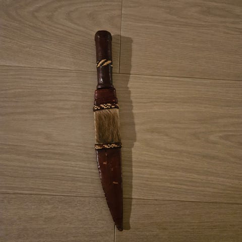 afrikansk kniv, tribal knife, etnografika, håndlaget kniv, seremoniell kniv, afrikansk håndverk, skinnslire, samlerobjekt, vintage kniv, dekorativ kniv