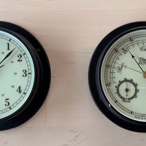 14 cm i diameter, urskive 9 cm. Høyde ca 5 cm. Ubrukt veggklokke i messing med rund form og glassfront. Klokken har romertall på urskiven og er designet for veggmontering. Passer til dekorasjon i maritimt inspirerte rom eller båter.