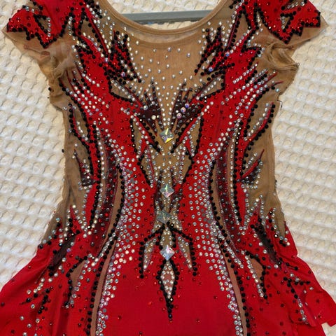 Rg-frakt for barn (10 år) med blå og hvite detaljer. Drakten har lange ermer og dekorative elementer som krystaller, blomster og paljetter. Fin og dekkende drakt som er nydelig på.