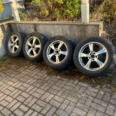 Dekkene er balansert og klare til bruk. Har stått lagret. Ingen skader på felger eller dekk (se bilder). Nye muttere følger med.