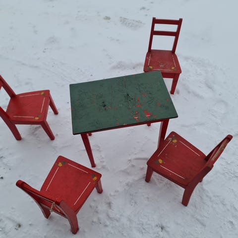 IKEA barnemøbler bestående av et hvitt bord og to hvite stoler. Møblene er designet for barn og egner seg til bruk i barnerom eller lekeområder.