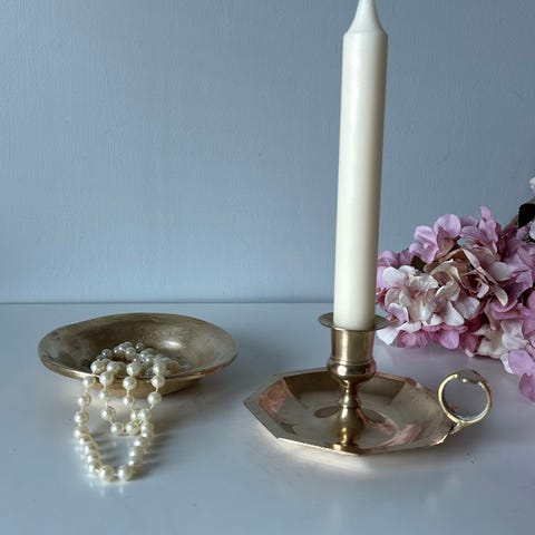 Vintage svensk messing lysestake / kammerstake med håndtak og rund skål for oppsamling av voks. Egnet for bruk med vanlige stearinlys og dekorasjon i hjemmet. H: 5 cm. Naturlig patina og bruksmerker kan forekomme. Søkeord: vintage, retro, interiør,stue,dekor,dekorasjon,design,stilrent,elegant, julepynt