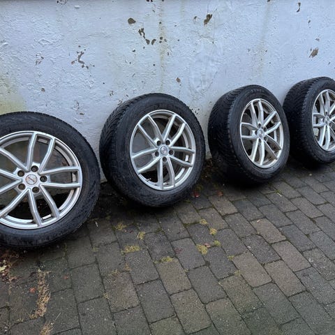 Fire stk komplette hjul med piggdekk. Dekkene er ganske nye, tror de bare er kjørt vinteren i fjor. Mulig jeg husker feil. Har ikke så mye peiling på bil, men de virker å være i god stand. Har blitt oppbevart på dekkhotell til for en uke siden. Felgene er eldre og mer slitt, men ingen feil eller mangler som jeg vet om.