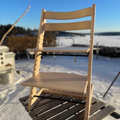 Stokke barnestol laget i tremateriale. Designet for barn med justerbare setehøyder og fotstøtte for tilpasset komfort.