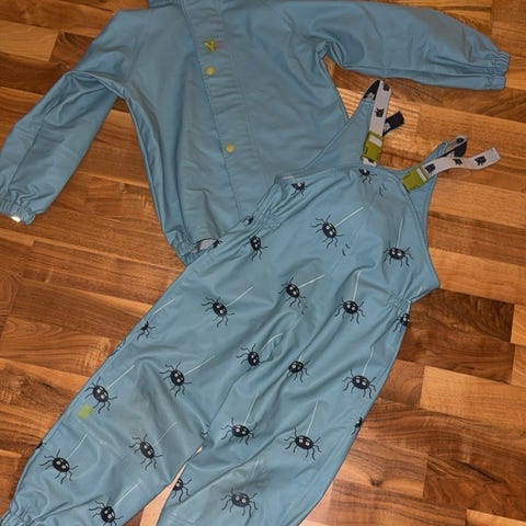 Veldig godt og slitesterkt regntøy - superfornøyd! Det er ikke noe feil med funksjonen, det holder helt tett - men har noen estetiske mangler. på grunn av slitasje. Mangler deler av refleks bak på det ene benet. Samt at stoffet på siden på toppen av jakken er litt slitt (se bilde 9). Ellers alt i godt stand.