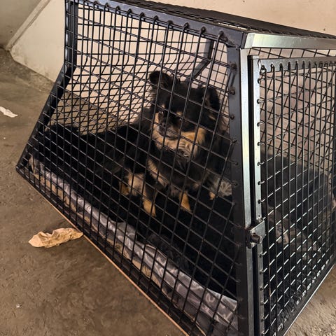 Sort metallbur for kjæledyr med gitterkonstruksjon. Egnet for sikring og transport av dyr. Robust og slitesterk utførelse.